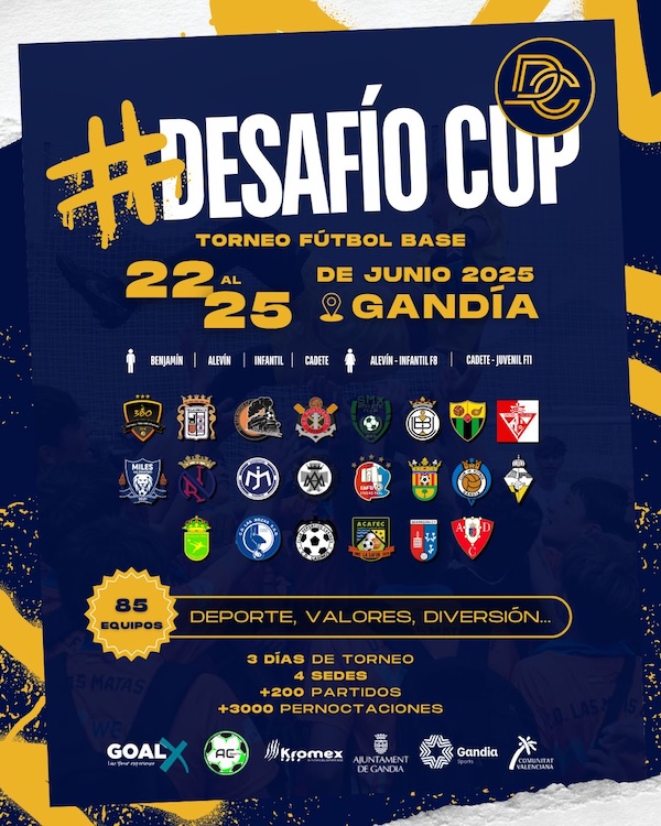 Gandia es convertirà una vegada més en epicentre de l’esport base amb la celebració del Torneig Desafío Cup Gandia, que tindrà lloc del diumenge 22 al 25 de juny, i reunirà més de 85 equips de tot Espanya en una cita que combina esport, turisme i formació en valors.