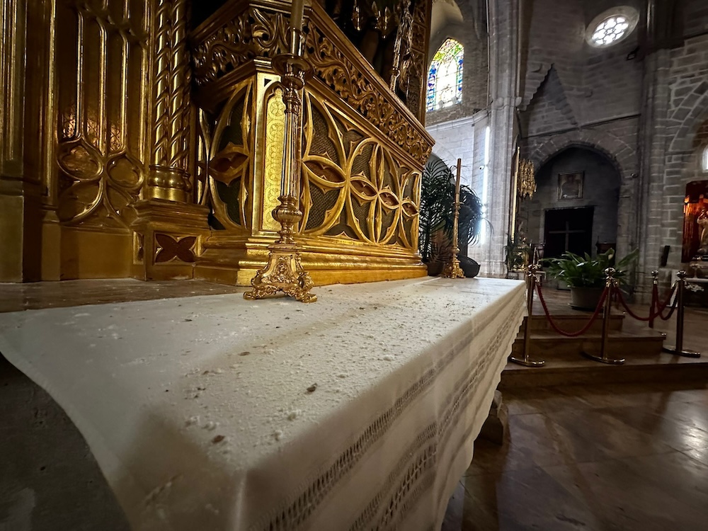 Llorens realizó recientemente un recorrido por el templo mostrando los daños visibles: piedras caídas en el suelo, muros afectados por humedades, goteras en los techos y cuadros eléctricos deteriorados. “Se necesita mucho dinero para subsanar todo este deterioro de una restauración en la que no se utilizó el material adecuado”, apunta. Dinero que la parroquia no puede asumir tan solo con sus feligreses y las visitas guiadas: “Nos hemos abierto al turismo, pero las visitas no dan tanto dinero”.