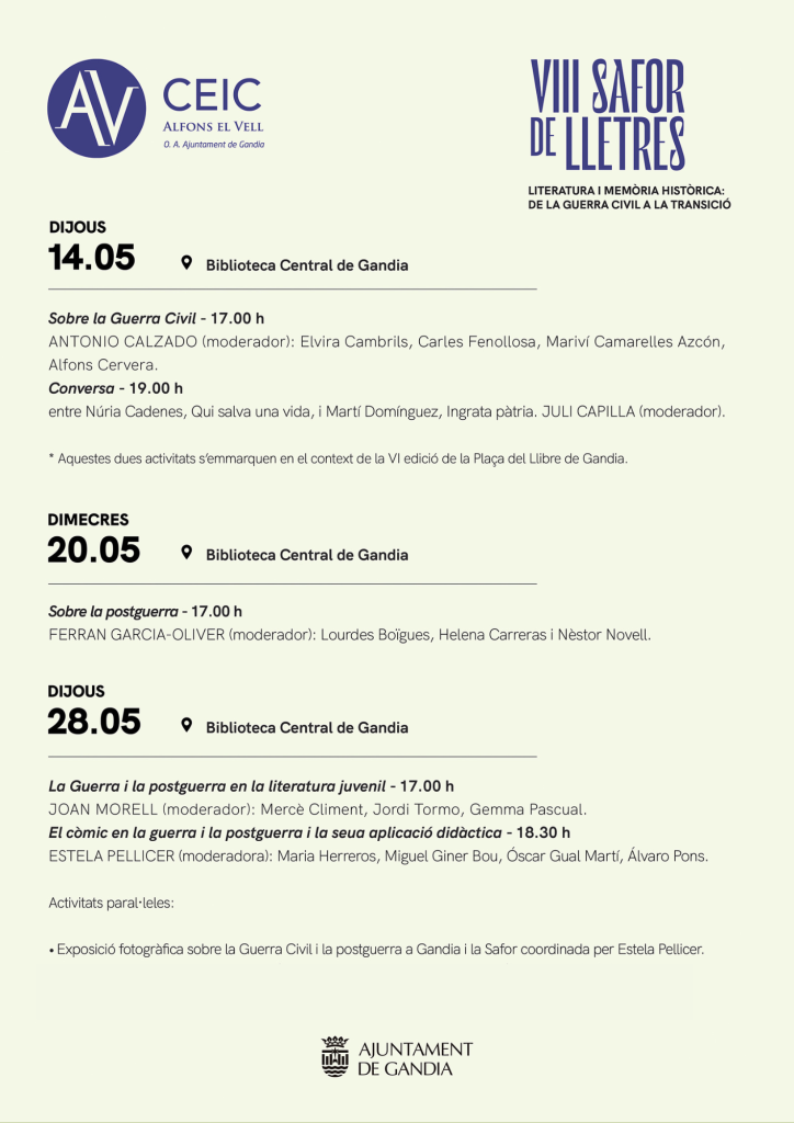 Paral·lelament, dins de la VIII edició de Safor de Lletres, el claustre de la biblioteca central acollirà fins al 25 de maig una exposició fotogràfica sobre la Guerra Civil i la postguerra a Gandia i la Safor, coordinada per Estela Pellicer.