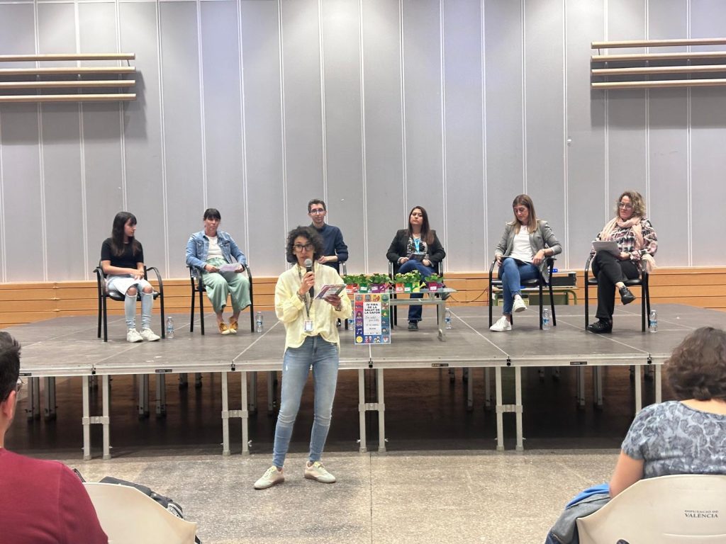 La primera jornada va comptar amb la taula d’experiències comunitàries ‘Teixint xarxes per al benestar emocionAl de la joventut’ a càrrec de professionals que treballen en aquest àmbit: Alicia Alvarado, orientadora de l’IES Jaume II El Just de Tavernes de la Valldigna; Cristina Doménech, infermera de la Consulta Jove del centre de salut d’Oliva; Javier Llinares, psicòleg de la Unitat de Detecció Precoç de Salut Mental del Departament de Salut de Gandia; Paula Escrivà, psicóloga del programa ‘Parlem’ de l’Ajuntament de Gandia, i un testimoni de ‘Parlem’.
