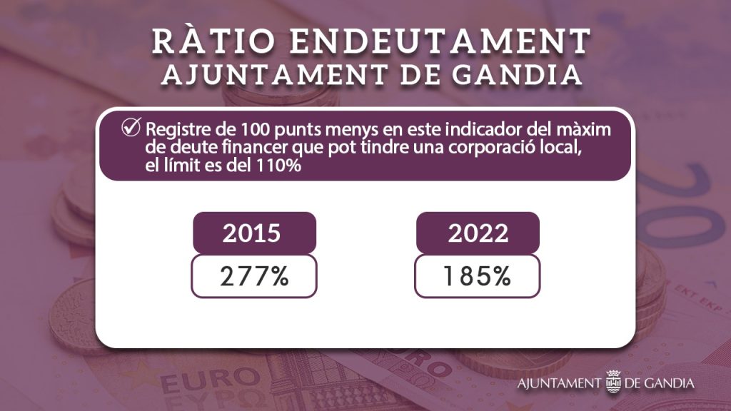 La mejora desde 2015 es muy sustancial como resultado del saneamiento de las finanzas municipales, ya que en 2015 la cifra ascendía a 277% y ahora se ha situado en 185’7% por encima del límite.