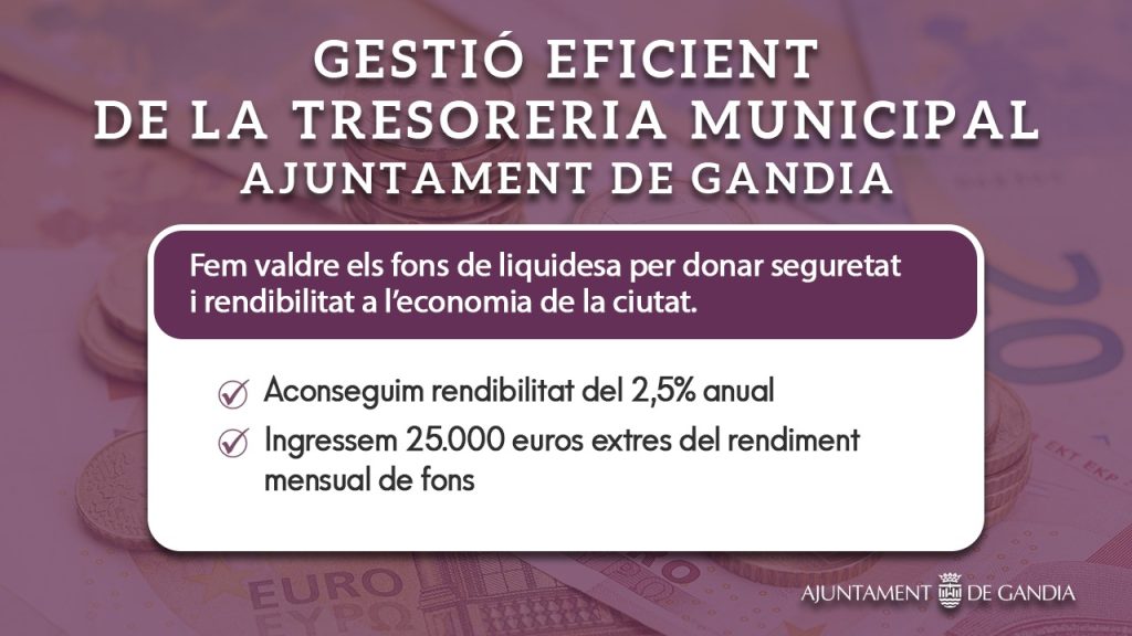 Dicho depósito permite recuperar la cantidad invertida en el momento en que sea necesario, pero mientras no lo es, el rendimiento mensual es de 25.000 €, lo que supone un ingreso adicional para seguir mejorando la tesorería municipal.
